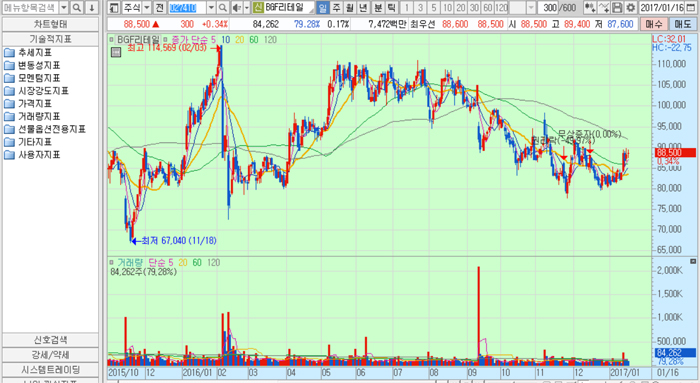 BGF리테일의 주가는 16일 종가 8만8500원으로 2016년 2월 3일의 고점 11만4569원에 비해 22.8% 하락한 수준에서 거래되고 있다.