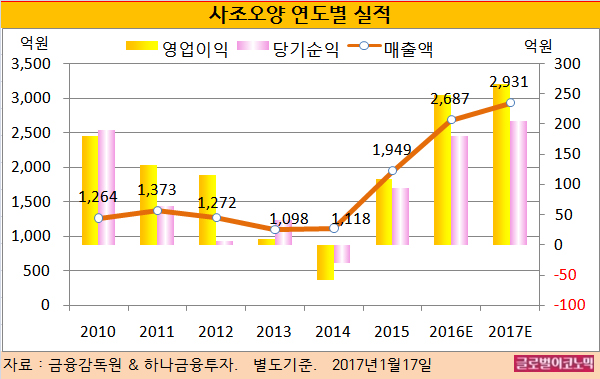 이 연구원은 “사조오양이 2017년에도 실적 우상향을 보일 것”이라며 “가공식품 부문 또한 HMR 시장 확대와 금산공장 가동률 상승에 따라 실적이 성장될 것”이라고 전망했다.