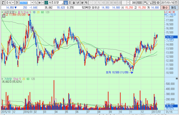사조오양의 주가는 16일 종가 1만4950원으로 2016년 11월 9일의 1만500원에 비해 42.4% 상승한 수준에서 거래되고 있다.