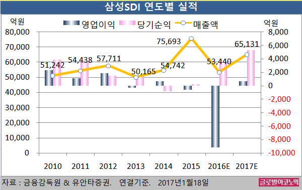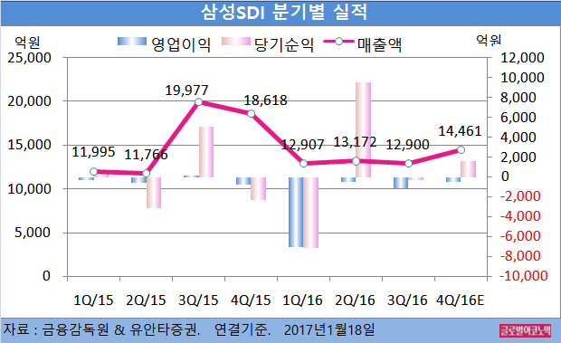 삼성에스디아이의 2016년 4분기 예상실적은 매출액 1조4461억원(전년동기비 -22.3%), 영업이익 -457억원(적자지속), 당기순이익 1560억원(흑자전환)으로 예상된다.