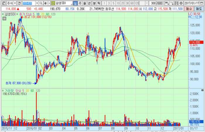 삼성SDI의 주가는 17일 종가 11만4000원으로 2016년 1월 26일의 저점 8만7300원에 비해 30.6% 상승한 수준에서 거래되고 있다.