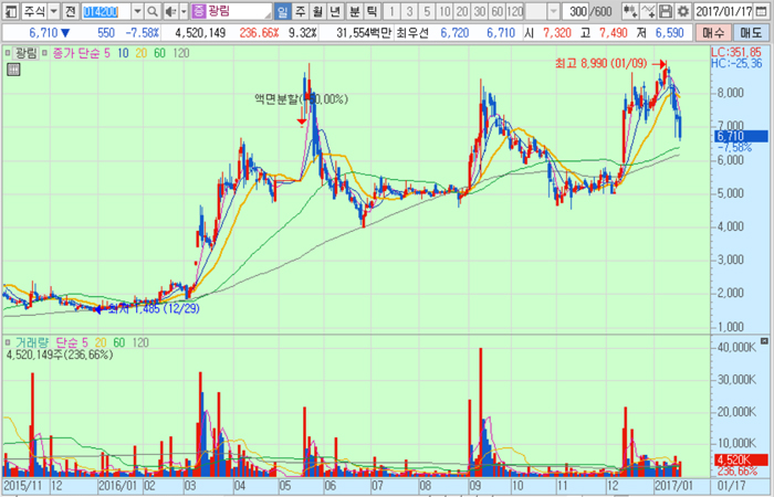 광림의 주가는 17일 종가 6710원으로 2015년 12월 29일의 저점 1485원에 비해 351.9% 상승한 수준에서 거래되고 있다.