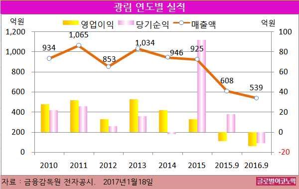 광림이 금감원에 제출한 2015년 매출액은 2372억원(연결기준), 영업이익 13억원, 당기순이익 92억원을 기록했다. 2015년 매출액에는 연결기준으로 되어 있어 매출액이 높아지게 됐고 2016년부터는 개별기준 재무제표가 적용됐다고 광림 측은 설명했다. 2015년 당기순이익이 높은 것도 연결기준에 따른 것으로 보인다.