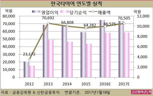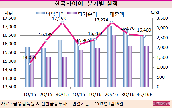 한국타이어의 2016년 4분기 실적은 매출액 1조6460억원(전년동기비 +3.1%), 영업이익 2,585억원(전년동기비 +8.1%), 당기순이익 2060억원(전년동기비 +8.7%)으로 전망된다.