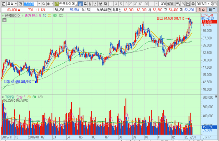 한국타이어의 주가는 17일 종가 6만3000원으로 2016년 1월 21일의 4만2450원에 비해 48.4% 상승한 수준에서 거래되고 있다.