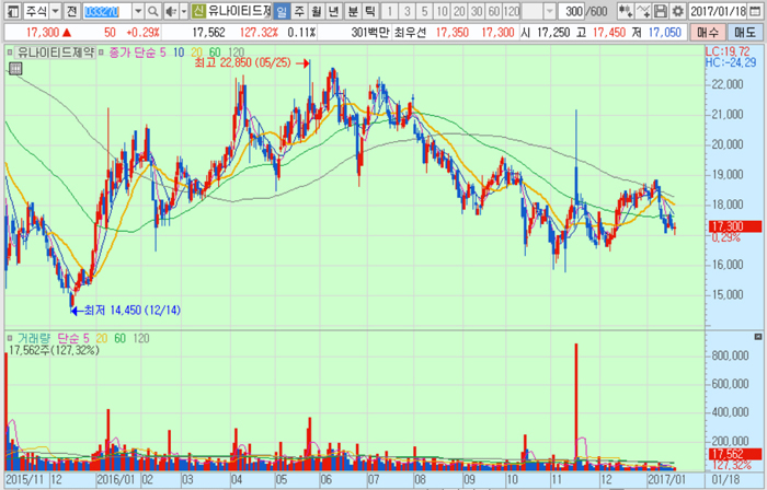 유나이티드제약의 주가는 18일 종가 1만7300원으로 2016년 5월 25일의 고점 2만2850원에 비해 24.3% 하락한 수준에서 거래되고 있다.