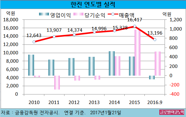 한진의 2016년 9월 말 현재 연결기준 매출액은 1조3196억원, 영업이익 -83억원, 당기순이익 518억원을 기록했다.