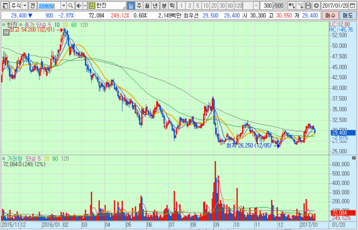 한진의 주가는 20일 종가 2만9400원으로 2016년 2월 1일의 고점 5만4200원에 비해 45.8% 하락한 수준에서 거래되고 있다.