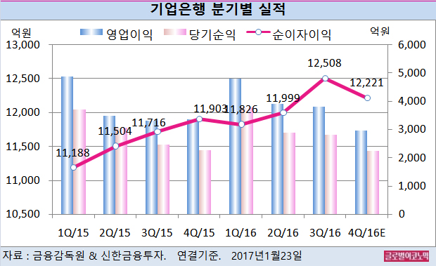 기업은행의 지난해 4분기 연결기준 순이자이익은 1조2221억원(전년동기비 +2.7%), 영업이익 2958억원(전년동기비 -11.7%), 지배주주 순이익 2250억원으로 예상된다.
