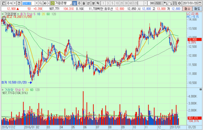기업은행의 주가는 20일 종가 1만2900원으로 2016년 1월 20일의 저점 1만500원에 비해 22.9% 상승한 수준에서 거래되고 있다.