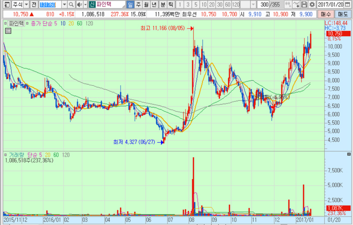 파인텍의 주가는 20일 종가 1만750원으로 2016년 6월 27일의 저점 4327원에 비해 148.4% 상승한 수준에서 거래되고 있다.