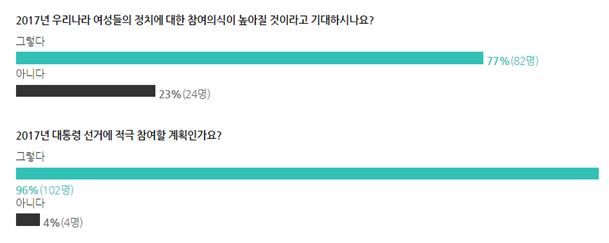 설문조사에 따르면 주부들은 올해 가장 중요한 이슈 1위를 대통령선거로 꼽은 뒤 2017년 대통령 선거에 적극적으로 참여할 계획을 묻는 질문에는 97%가 '그렇다'라고 답했다. 올해 대선에 대한 주부들의 높은 관심을 확인할 수 있는데, '우리나라 여성들의 정치에 대한 참여의식이 높아질 것인가'에 대한 질문에도 77%가 '높아질 것'이라는 반응을 보였다.
