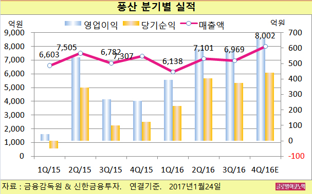 풍산의 2016년 4분기 매출액은 8002억원(전년동기비 +9.5%), 영업이익은 664억원(전년동기비 +158.0%), 당기순이익 440억원(전년동기비 +257.7%)에 이를 것으로 보인다. 영업이익률은 8.3%로 추정된다.