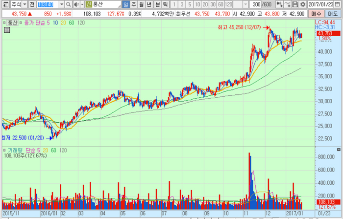풍산의 주가는 23일 종가 4만3750원으로 2016년 1월 20일의 저점 2만2500원에 비해 94.4% 상승한 수준에서 거래되고 있다.