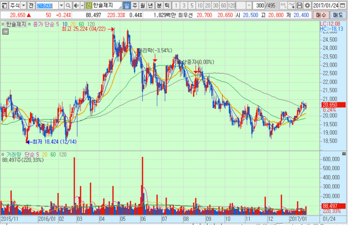 한솔제지의 주가는 24일 종가 2만650원으로 2016년 4월 22일의 고점 2만5224원에 비해 18.1% 내린 수준에서 거래되고 있다.
