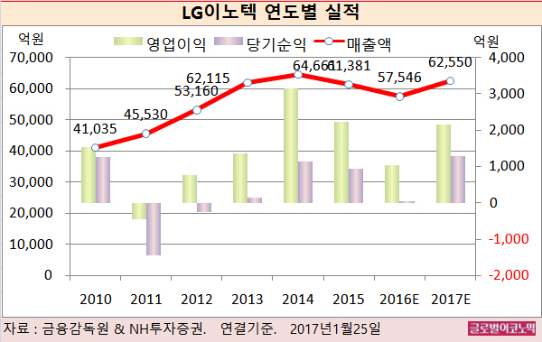 LG이노텍은 24일 공시를 통해 2016년 연결기준 매출액이 5조7546억원(전년비 -6.2%), 영업이익 1048억원(전년비 -53.2%), 당기순이익 49억원(전년비 -94.8%)으로 잠정 집계됐다고 밝혔다.