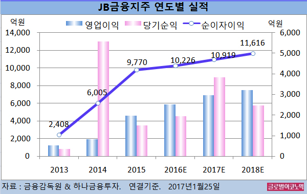 한 연구원은 JB금융지주의 2016년 4분기 연결기준 순이자이익이 2715억원(전년동기비 +8.6%), 영업이익 98억원(전년동기비 -79.1%), 당기순이익 74억원(전년동기비 -79.3%)에 이를 것으로 보고 있다.