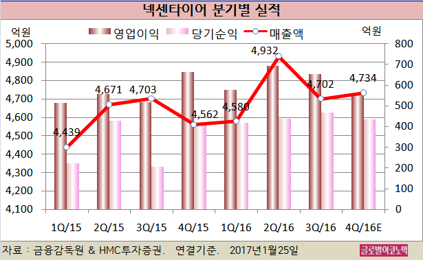 이 연구원은 넥센타이어의 2016년 4분기 연결기준 매출액이 4734억원(전년동기비 +3.8%), 영업이익 552억원(전년동기비 -16.6%), 당기순이익 434억원(전년동기비 +4.6%)에 이를 것으로 예상하고 있다.