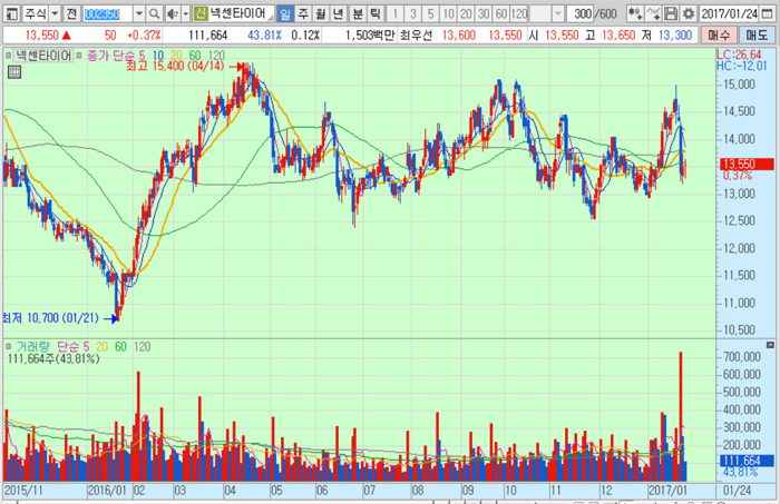 넥센타이어의 주가는 24일 종가 1만3550원으로 2016년 4월 14일의 고점 1만5400원에 비해 12.0% 하락한 수준에서 거래되고 있다.