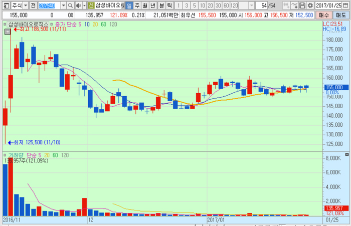삼성바이오로직스의 주가는 25일 종가 15만5000원으로 2016년 11월 11일의 고점 18만6500원에 비해 16.9% 하락한 수준에서 거래되고 있다.
