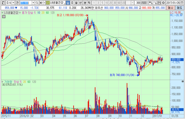 LG생활건강의 주가는 26일 종가 85만9000원으로 2016년 7월 8일의 고점 119만9000원에 비해 28.4% 하락한 수준에서 거래되고 있다.