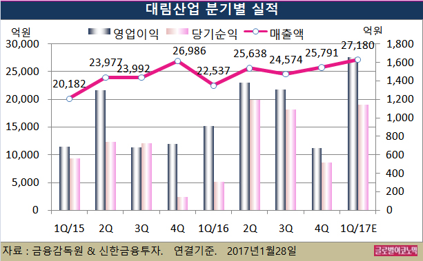 대림산업의 2016년 4분기 연결기준 실적은 매출액 2조5791억원(전년동기비 -4.4%), 영업이익 674억원(전년동기비 -6.4%), 당기순이익 517억원(전년동기비 +256.2% YoY)으로 잠정 집계됐다.
