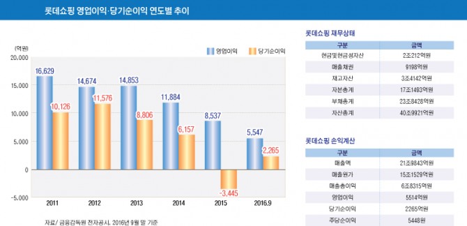 롯데쇼핑의 2015년 실적은 연결기준 매출액 29조1277억원, 영업이익 8537억원, 당기순이익 -3455억원을 기록했다. 롯데쇼핑의 2015년 순익은 어닝 쇼크로 증권가에 커다란 충격을 던졌다.