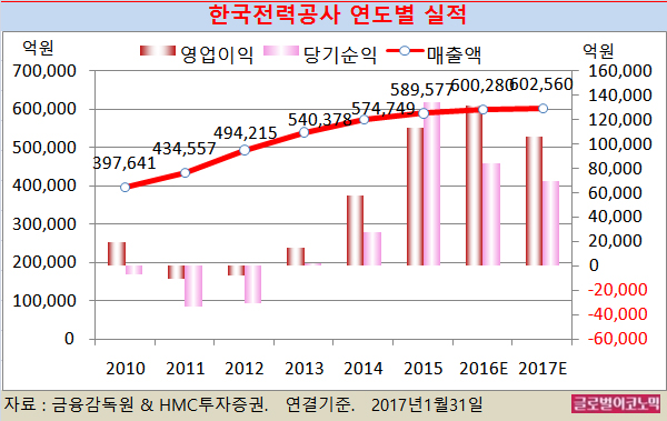 한국전력의 2016년 4분기 연결기준 매출액은 15조1240억원(전년동기비 +2.9%), 영업이익 2조3910억원(전년동기비 -10.7%), 지배주주 순이익 1조5540억원에 이를 예상이다.