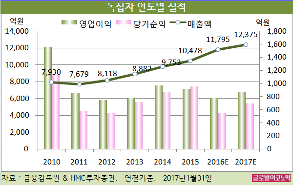 녹십자의 2016년 연결기준 매출액은 1조1795억원(전년비 +12.5%), 영업이익 778억원(전년비 -15.2%), 당기순이익 553억원(전년비 -42.2%)으로 예상된다.