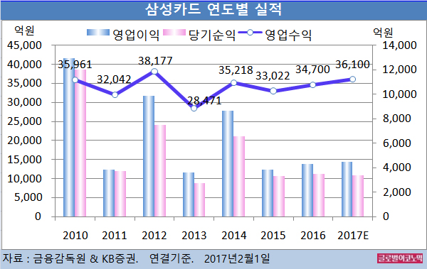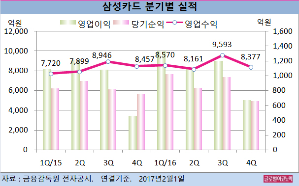 삼성카드의 2016년 4분기 연결기준 영업수익 8377억원(전년동기비 -0.9%), 영업이익 673억원(전년동기비 -44.6%), 당기순이익 657억원(전년동기비 -29.4%)을 기록한 것으로 잠정 집계됐다.