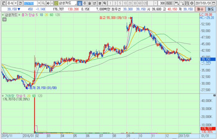 삼성카드의 주가는 지난달 31일 종가 3만9150원으로 2016년 9월 13일의 고점 5만5300원에 비해 29.2% 하락한 수준에서 거래되고 있다.