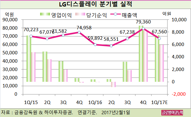 정 연구원은 LG디스플레이의 올해 1분기 연결기준 매출액이 6조7560억원(전년동기비 +12.8%), 영업이익 7510억원(전년동기비 +1801.3%), 당기순이익 5970억원(전년동기비 +4만9650.0%)를 기록할 것으로 내다보고 있다.