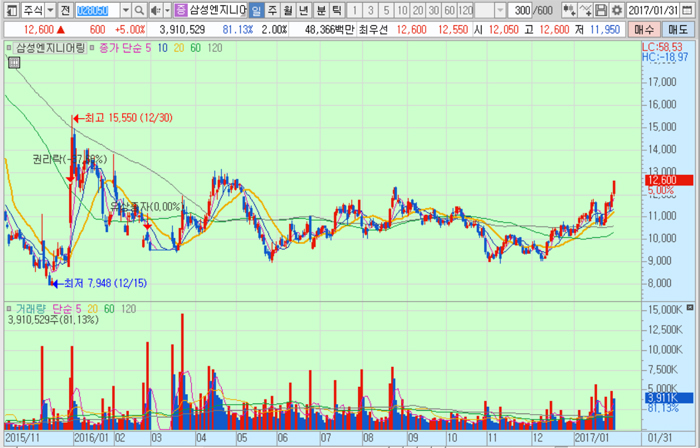 삼성엔지니어링의 주가는 지난달 31일 종가 1만2600원으로 2015년 12월 15일의 저점 7948원에 비해 58.5% 상승한 수준에서 거래되고 있다.