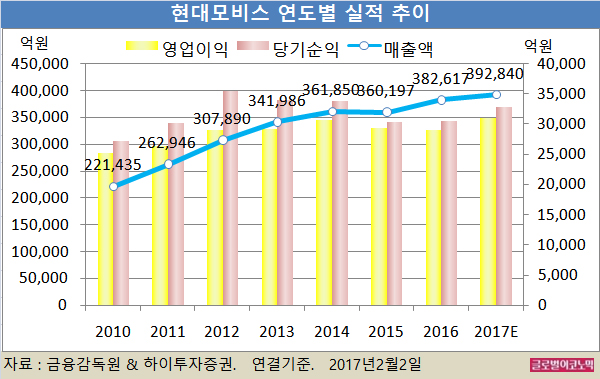 현대모비스의 2016년 연결기준 매출액은 38조2617억원(전년비 +6.2%), 영업이익 2조9047억원(전년비 -1.0%), 당기순이익 3조473억원(전년비 +0.2%)으로 잠정 집계됐다.