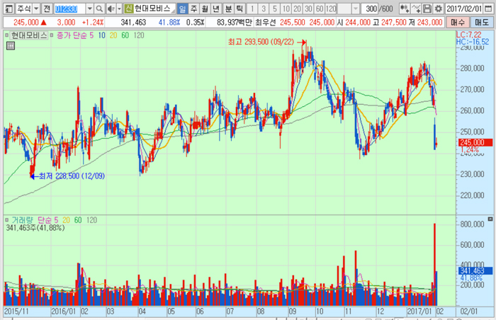 현대모비스의 주가는 1일 종가 24만5000원으로 2016년 9월 22일의 29만3500원에 비해 16.5% 하락한 수준에서 거래되고 있다.