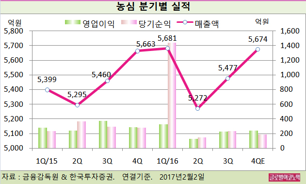농심의 2016년 4분기 연결기준 매출액은 5674억원(전년동기비 +0.2%), 영업이익 243억원(전년동기비 -15.8%), 당기순이익 190억원(전년동기비 -32.9%)에 이를 것으로 예상된다.