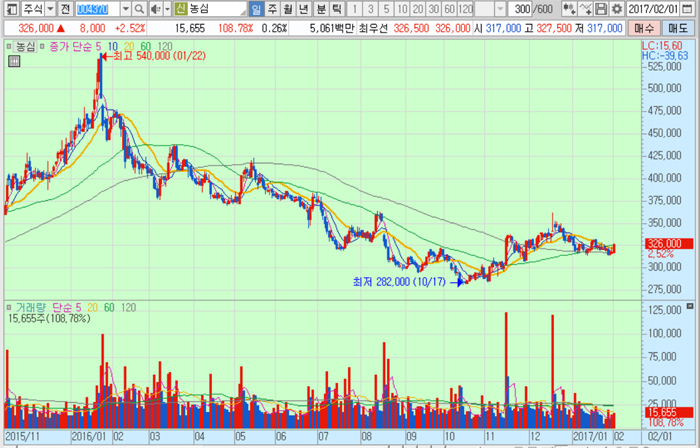 농심의 주가는 1일 종가 32만6000원으로 2016년 1월 22일의 고점 54만원에 비해 39.6% 하락한 수준에서 거래되고 있다.
