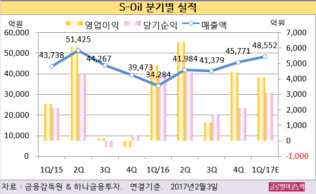 S-Oil의 2016년 4분기 연결기준 매출액은 4조5771억원(전년비 +16.0%), 영업이익 4440억원(흑자전환), 당기순이익 2135억원(전년비 +504.8%)으로 잠정 집계됐다.