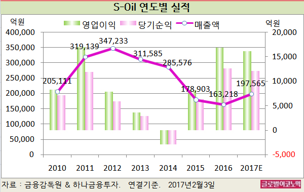 S-Oil의 2016년 연결기준 매출액은 16조3218억원(전년비 -8.8%), 영업이익 1조6929억원(전년비 +107.1%), 당기순이익 1조2622억원(전년비 +99.9%)으로 잠정 집계됐다.