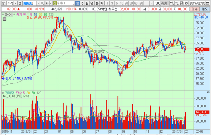 S-Oil의 주가는 2일 종가 8만2000원으로 2016년 4월 1일의 고점 9만8200원에 비해 16.5% 하락한 수준에서 거래되고 있다.