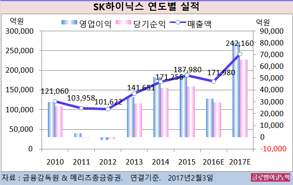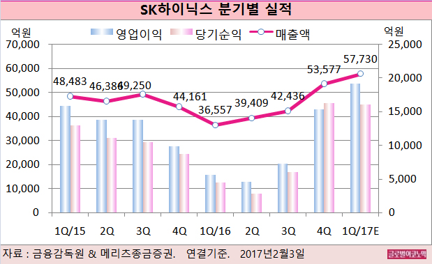SK하이닉스의 2016년 4분기 실적은 매출 5조3577억원(전년동기비 +21.3%), 영업이익 1조5361억원(전년동기비 +55.3), 당기순이익 1조6286억원(전년동기비 56.9%)으로 잠정 집계됐다.