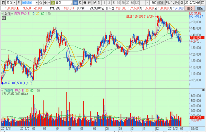 SK하이닉스의 주가는 2일 종가 13만8000원으로 2016년 12월 8일의 고점 15만5000원에 비해 11.0% 내린 수준에서 거래되고 있다.