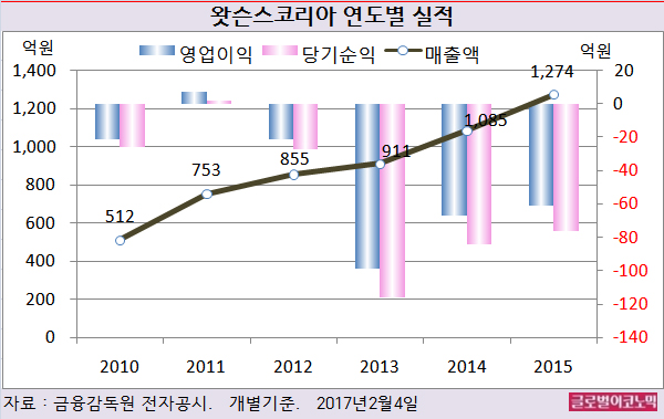 2015년 말 현재 왓슨스코리아의 자본금은 794억원 규모이나 결손금 495억원이 발생해 자본총계가 298억원으로 줄어들었다.