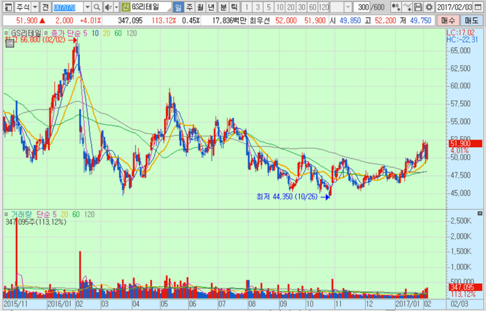 GS리테일의 주가는 3일 종가 5만1900원으로 2016년 2월 2일의 고점 6만6800원에 비해 22.3% 하락한 수준에서 거래되고 있다.