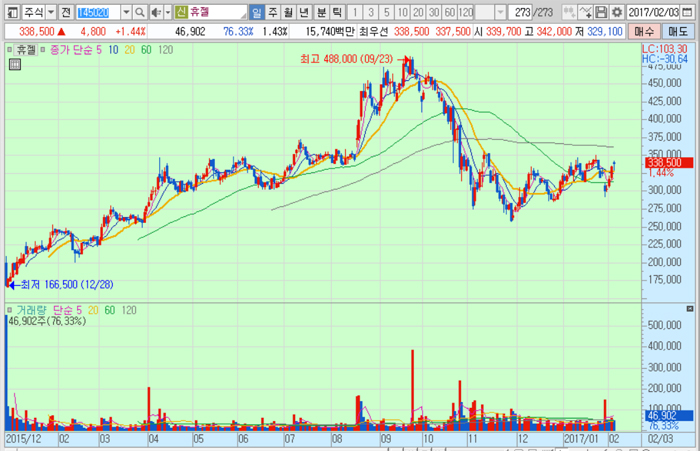 휴젤의 주가는 3일 종가 33만8500원으로 2016년 9월 23일의 고점 48만8000원에 비해 30.6% 하락한 수준에서 거래되고 있다.