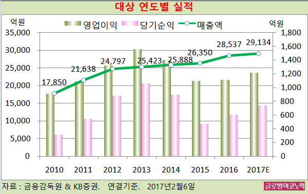 대상의 2016년 연결기준 매출액은 2조8537억원(전년비 +8.3%), 영업이익 1112억원(전년비 +1.2%), 당기순이익 609억원(전년비 +29.0%)으로 잠정 집계됐다.