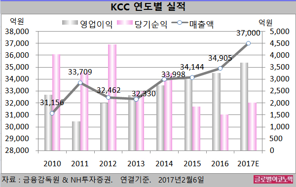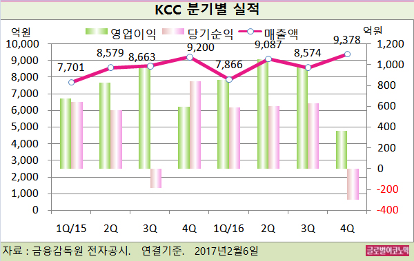 KCC의 2016년 4분기 연결기준 매출액은 9378억원(전년동기비 +1.9%), 영업이익 365억원(전년동기비 -38.4%), 당기순이익 -296억원(적자전환)으로 잠정 집계됐다.