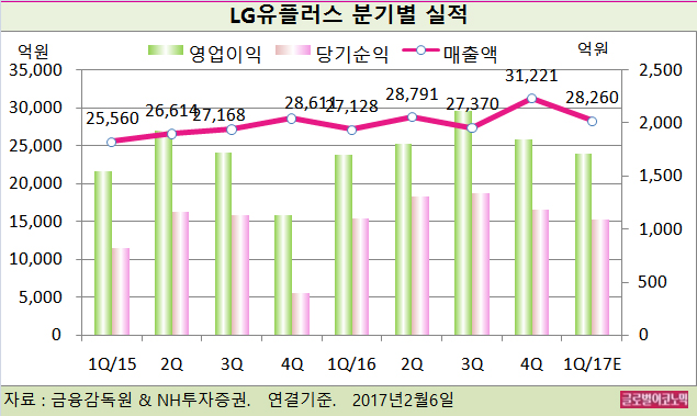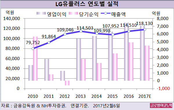 LG유플러스의 2016년 연결기준 매출액은 11조4510억원(전년비 +6.1%), 영업이익 7465억원(전년비 +18.1%), 당기순이익 4927억원(전년비 +40.3%)으로 잠정 집계됐다.