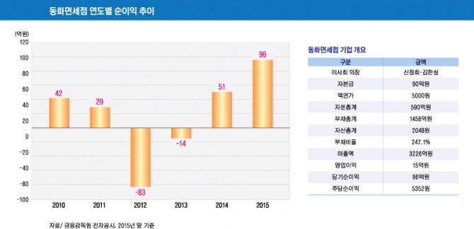 동화면세점의 2015년 말 재무상태를 보면 자본금은 90억원, 자본총계 590억원, 부채총계 1458억원, 자산총계 2048억원으로 되어 있다.