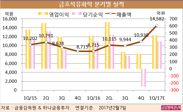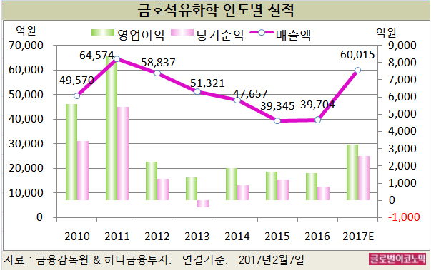 금호석유화학의 2016년 연결기준 매출액은 3조9704억원(전년비 +0.9%), 영업이익 1564억원(전년비 -4.6%), 당기순이익 800억원으로 잠정 집계됐다.
